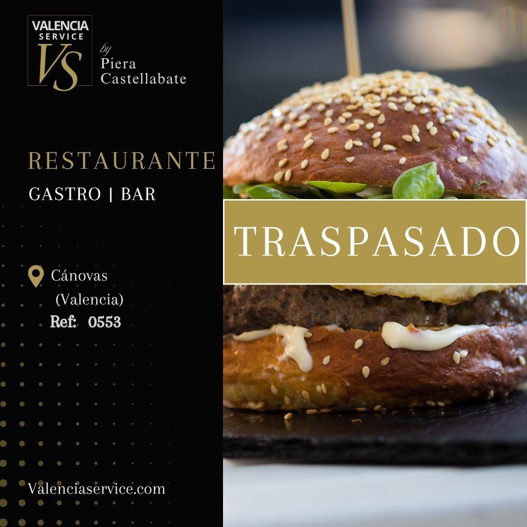 Se traspasa por cambio de país restaurante gastro bar en una de las calle más emblemática de Cánovas, en uno de los barrios con ocio y movida más exitoso y demandado de la ciudad con todo tipo de hostelería como pub, bares, cafeterías, pizzerías, hamburgueserías, restaurantes japoneses, argentinos, italianos, etc. A unos pasos del centro de Valencia, Gran Via Marques del Turia y Colón.